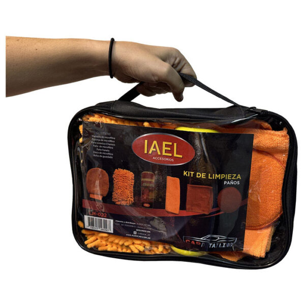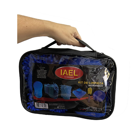 Kit de limpieza automotor azul en bolso, cepillo de llantas, microfibra, esponja absovente, esponja microfibra, guante microfibra y disco de